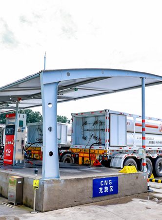 CNG充裝區配備高效加氣柱,站內設施設計日充裝能力達115萬立方米。天然氣經過精密調壓、脫水及壓縮工藝處理后,通過專業CNG槽車完成充裝與加注,服務覆蓋工業與車用燃氣市場。